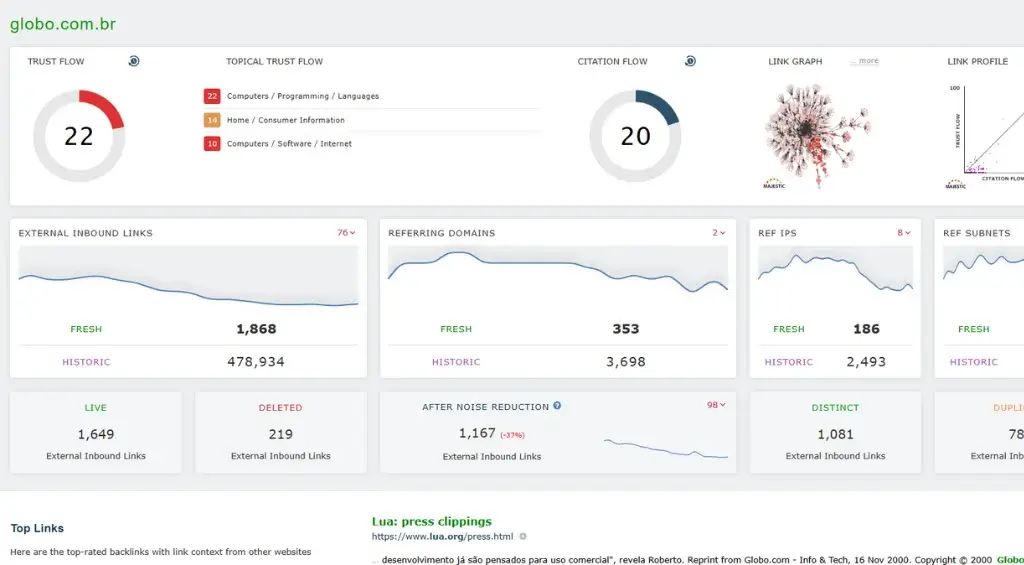 • Majestic: trabalha com o Trust Flow (TF) e o Citation Flow (CF), que indicam a credibilidade e o volume de links recebidos.