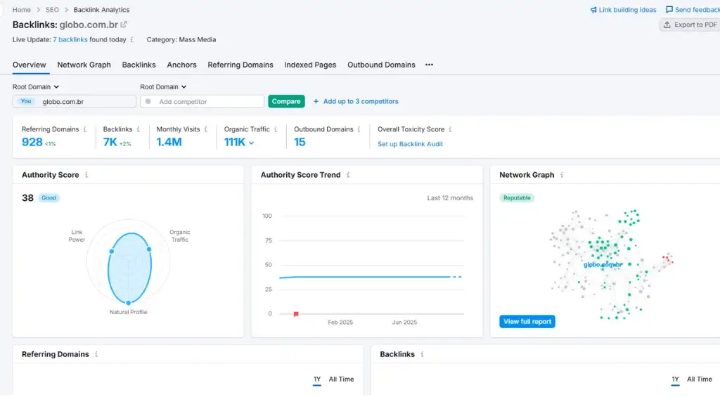 A Semrush oferece uma visão completa do ambiente competitivo e das oportunidades de crescimento em SEO. Ela permite analisar os backlinks de qualquer domínio e comparar estratégias com outros sites do mesmo segmento. Essa análise ajuda a descobrir quais links realmente contribuem para o aumento da autoridade e quais precisam de ajustes.
