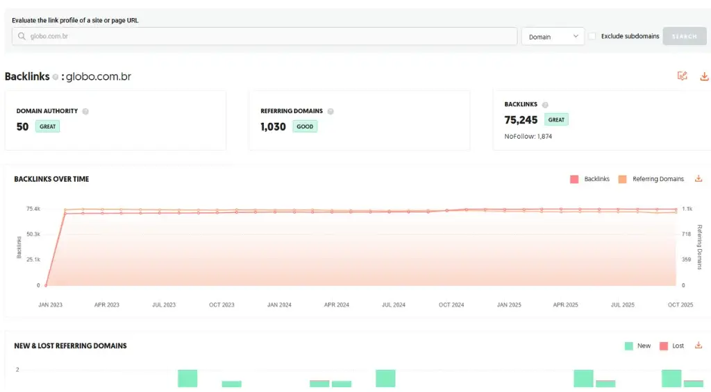 A plataforma também permite mapear toda a rede de links que aponta para um domínio. Com esses dados, profissionais conseguem visualizar a estrutura de autoridade construída e identificar possíveis desequilíbrios entre quantidade e qualidade. Essa abordagem torna a gestão do perfil de backlinks mais eficiente e estratégica.